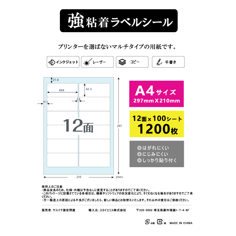 ■商品概要:ラベルシール a4 12面 角丸 100シート 1200片 強粘着 ラベルサイズ 83.8mm x 42.3mm マット紙